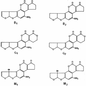 Les aflatoxines comptent 17 molécules mais seuls 4 ont été isolées : Ce sont des métabolites de la bis-furanno-coumarine. Ils se distinguent les uns des autres par la couleur de fluorescence :- Les composés B sont bleus à 425 nm.