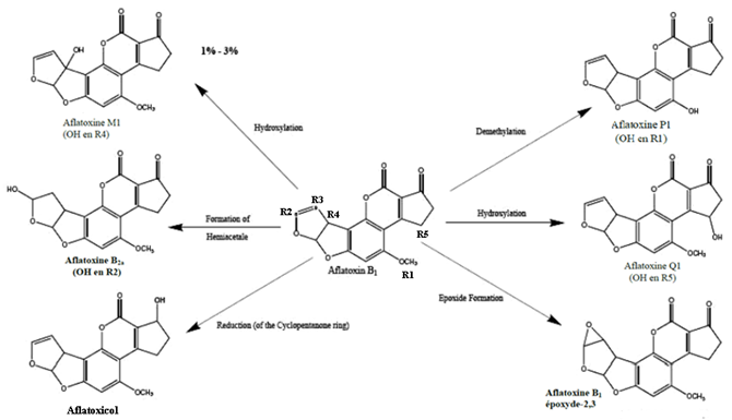 Absorption : principalement par voie orale lors de l'ingestion d'aliments contaminés. Distribution : Rapide car elles sont des molécules très lipophiles. Stockage : foie+++, rein, tissus musculaires et adipeux. Passage transplacentaire possible. Métabolisme : Pour être toxique ou mutagène, l’AFB1 doit être métabolisée par les enzymes microsomiales hépatiques NADP dépendantes. Il s’agit principalement d’une réaction d’hydroxylation qui aboutit à la formation de dérivés hydroxylés.Mécanisme d’action toxique