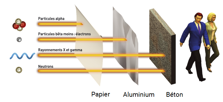 Le rayonnement ionisant est classé par la nature des particules ou des ondes électromagnétiques qui sont responsables de l'effet ionisant. Les mécanismes d'ionisation sont différents. Les rayonnements ionisants Toute particule massive chargée peut ioniser des atomes directement par interaction fondamentale à travers la force de Coulomb (La loi de Coulomb exprime, en électrostatique, la force de l'interaction électrique entre deux particules chargées électriquement.) si elle a une énergie cinétique suffisante. Cela inclut les noyaux atomiques, les électrons, les muons, les pions chargés, les protons et les noyaux chargés énergétiques de leurs électrons. En se déplaçant à des vitesses relativistes, ces particules ont une énergie cinétique suffisante pour devenir ionisantes, cependant les vitesses relativistes ne sont pas requises. Par exemple, une particule alpha typique est ionisante, mais se déplace à environ 5% c, et un électron avec 33 eV (assez pour s'ioniser) se déplace à environ 1% c. Particule Alpha: Les particules alpha sont constituées de deux protons et de deux neutrons liés ensemble en une particule identique à un noyau d'hélium. Particule Bêta: Les particules bêta sont des électrons β- ou des positrons β+ à haute énergie et qui se déplacent à haute vitesse émis par certains types de noyaux radioactifs, tels que le potassium 40. Rayonnements X et gamma: la pénétration de ces rayons est très importante et dépend de l’énergie du rayonnement et de la nature du milieu traversé. À épaisseur d'écran identique, le rayonnement gamma est atténué par : le plomb, l'acier, le béton, l’eau (par ordre d'efficacité décroissante). Neutrons : les neutrons sont des particules élémentaires non chargées, ils ne produisent pas d'ionisations en traversant la matière mais en provoquant des fissions nucléaires, ils peuvent générer des rayonnements ionisants.